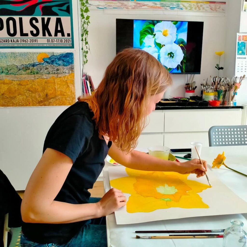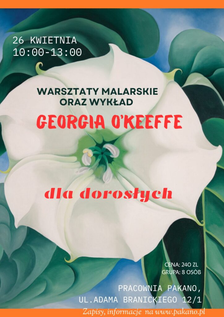 26 kwietnia zanurzyłyśmy się wspólnie w świat niezwykłej artystki. Oglądałyśmy dzieła malarskie Georgii O’Keeffe oraz intymne fotografie z jej życia. Podczas wykładu rozmawiałyśmy o wrażliwej, wspaniałej i silnej kobiecie, która odnalazła własną drogę z dala od wielkiego miasta. Po chwili wytchnienia, same stałyśmy się twórcami, malując swój własny kwiat w powiększeniu.