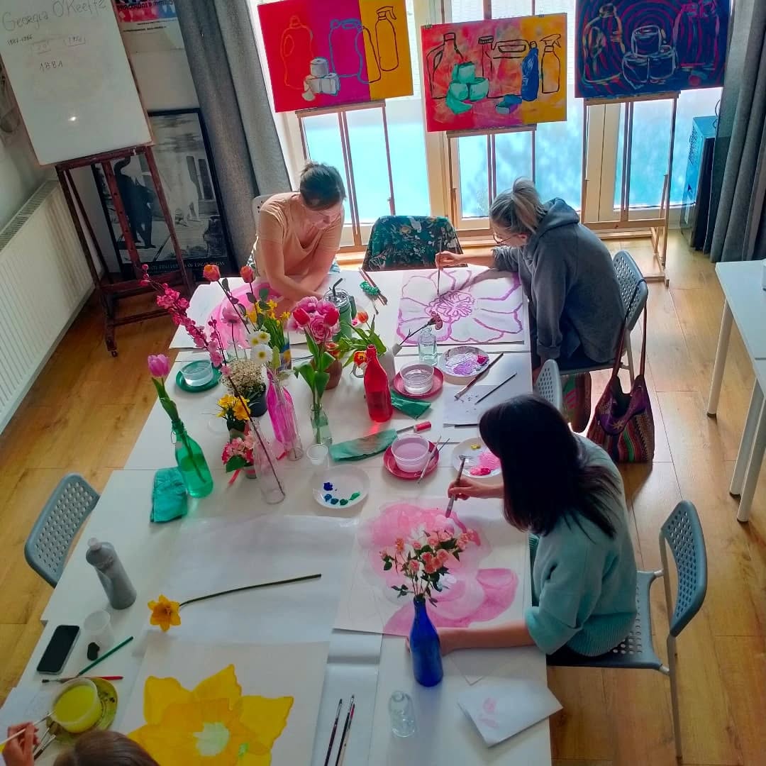 26 kwietnia zanurzyłyśmy się wspólnie w świat niezwykłej artystki. Oglądałyśmy dzieła malarskie Georgii O’Keeffe oraz intymne fotografie z jej życia. Podczas wykładu rozmawiałyśmy o wrażliwej, wspaniałej i silnej kobiecie, która odnalazła własną drogę z dala od wielkiego miasta. Po chwili wytchnienia, same stałyśmy się twórcami, malując swój własny kwiat w powiększeniu.